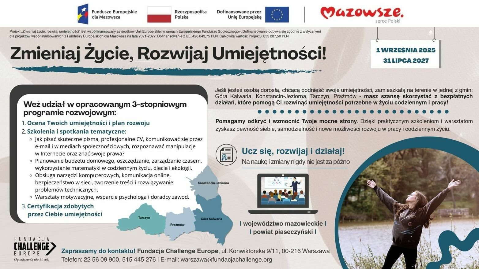 Chcesz nauczyć się czegoś nowego i ułatwić sobie codzienne życie?Jeśli masz 18 lat lub więcej i mieszkasz w jednej z gmin: Góra Kalwaria, Konstancin-Jeziorna, Tarczyn albo Prażmów, zapraszamy Cię do udziału w bezpłatnym projekcie „Zmieniaj życie, rozwijaj umiejętności!”.