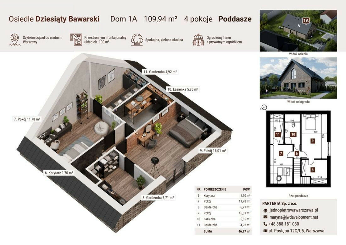 Dom oferuje około 111 m² funkcjonalnej przestrzeni z użytkowym poddaszem oraz prywatnym ogrodem.